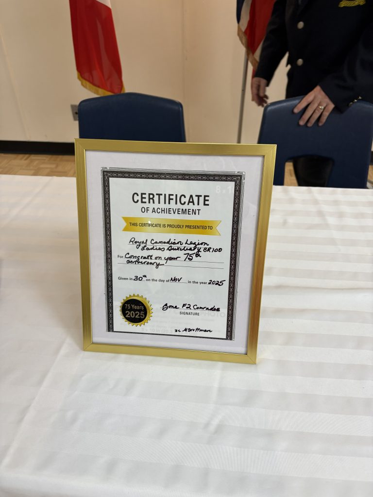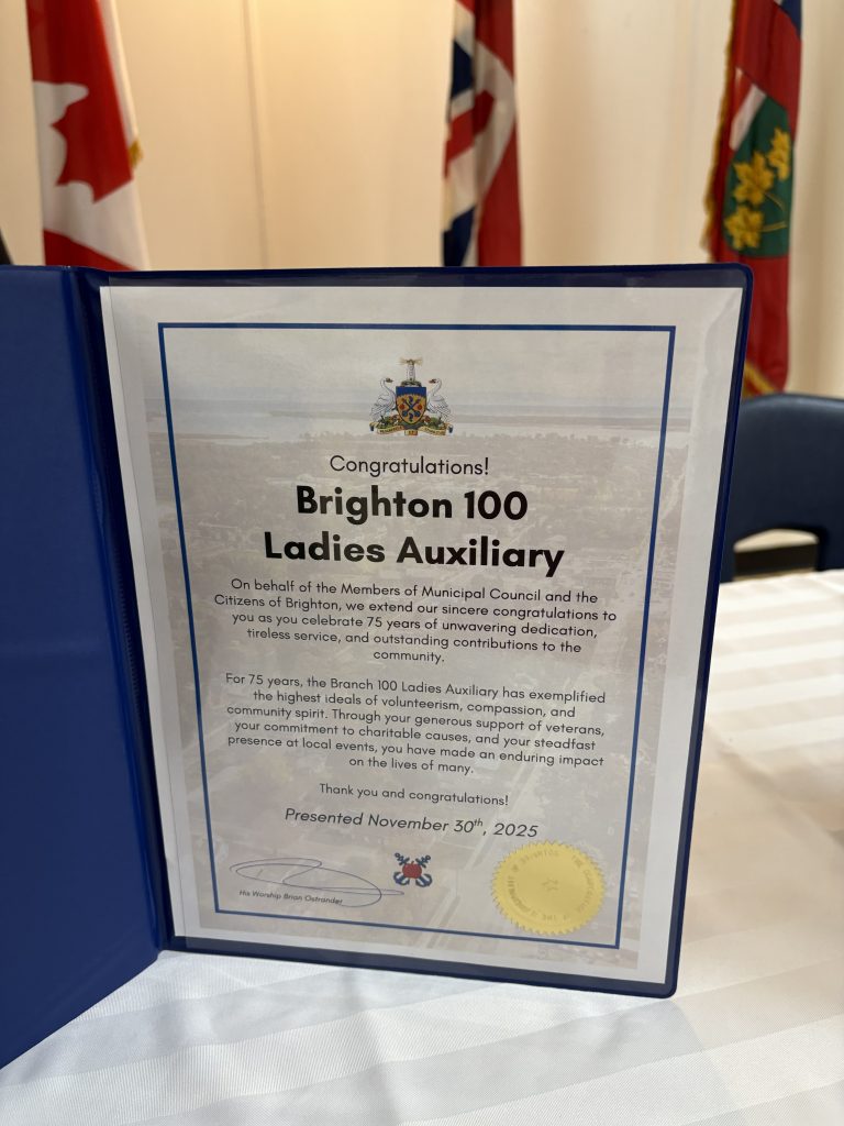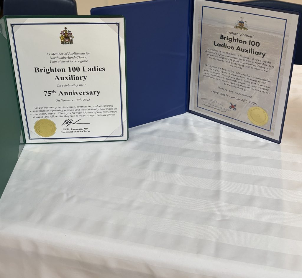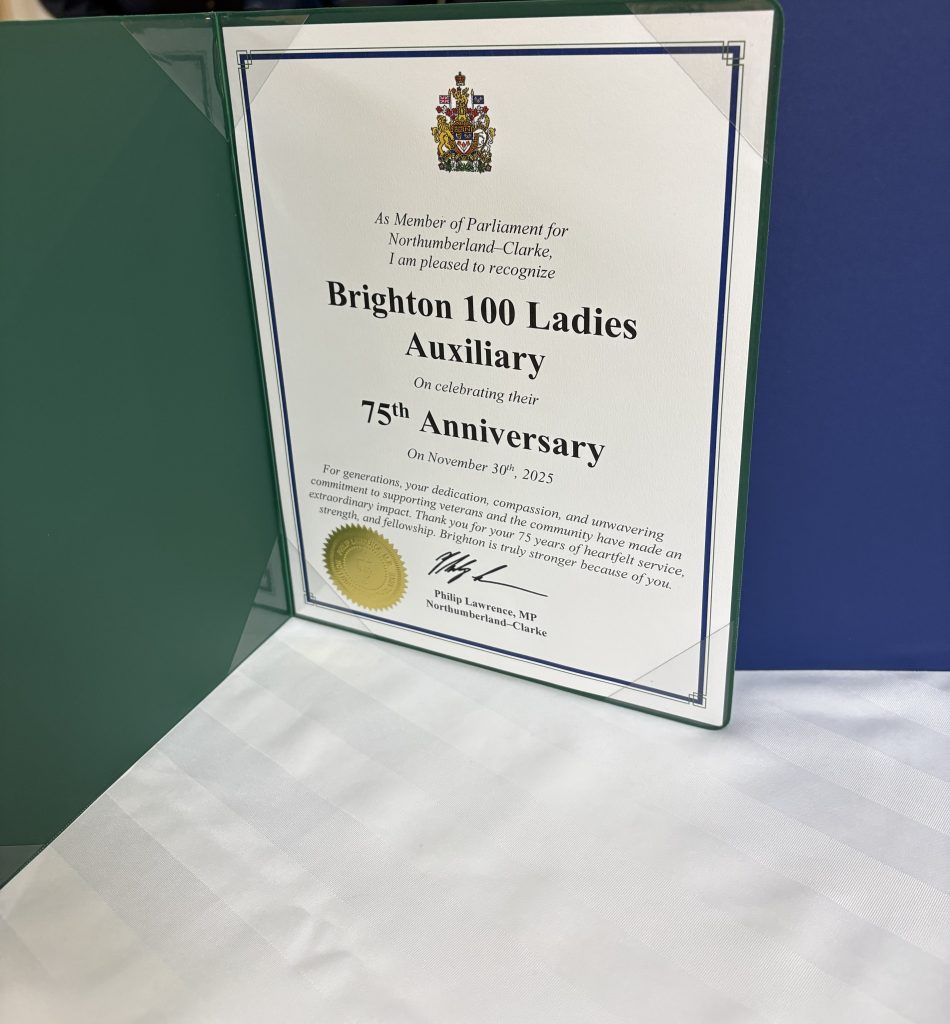On Sunday, November 29th, Branch 100 hosted a celebration for the Ladies Auxiliary’s 75th anniversary year. The event was supported by Sandra Brant Sparks, Ladies Auxiliary President; Michael French, Branch 100 President; MP Philip Lawrence (Northumberland-Clarke); Yolande McKinnon, First Vice-President of Ontario Command; Glenda Trottman Zone Commander Aldene Cooper, Deputy Zone Commander; and Brian Ostlander, Mayor of Brighton.