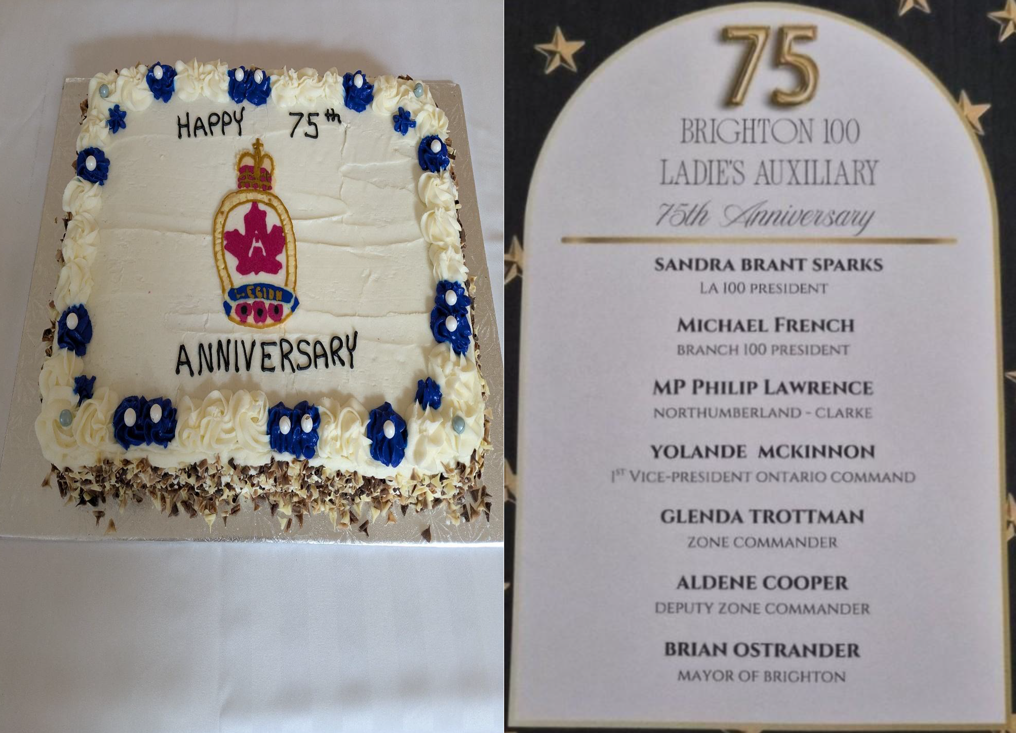 On Sunday, November 29th, Branch 100 hosted a celebration for the Ladies Auxiliary’s 75th anniversary year. The event was supported by Sandra Brant Sparks, Ladies Auxiliary President; Michael French, Branch 100 President; MP Philip Lawrence (Northumberland-Clarke); Yolande McKinnon, First Vice-President of Ontario Command; Glenda Trottman Zone Commander Aldene Cooper, Deputy Zone Commander; and Brian Ostlander, Mayor of Brighton.