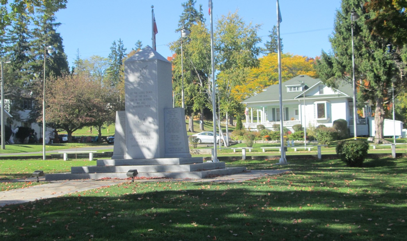 The cenotaph stands in Memorial Park in the community of about 1,100, near Canadian Forces Base Trenton, the start of the Highway of Heroes. It replaces a cenotaph which had been dedicated in 1927 by Sir Arthur Currie who led the Canadian Corps during the First World War. The earlier monument was decommissioned in May and respectfully dismantled to make way for the new monument with the theme, Passing The Torch From Generation To Generation.